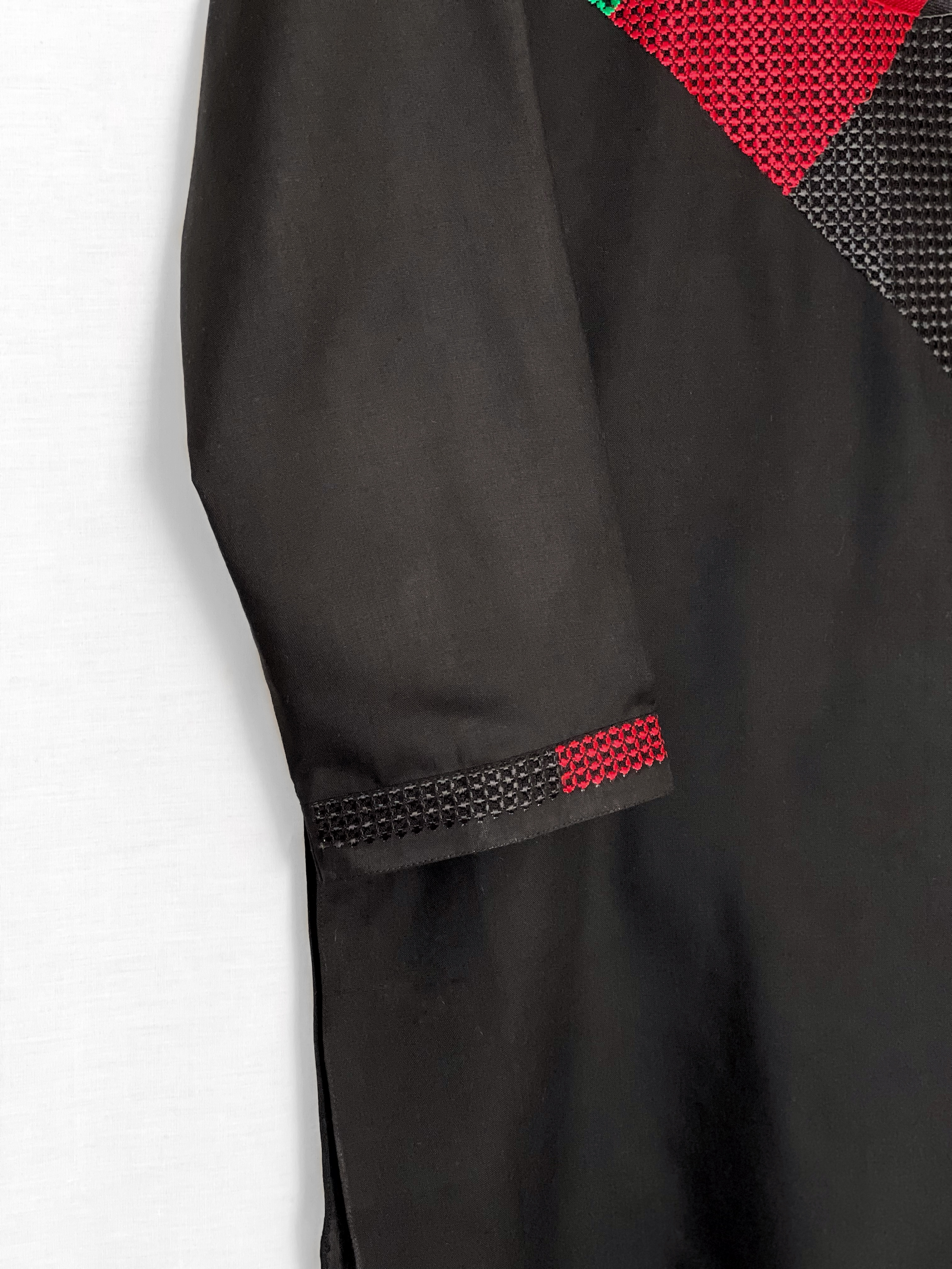 Two-piece long shirt with rounded hem and wide-leg drop-crotch pants in soft cotton. Featuring specially embroidered bodice and cuffs famous for its beautiful traditional Afghan geometric design.