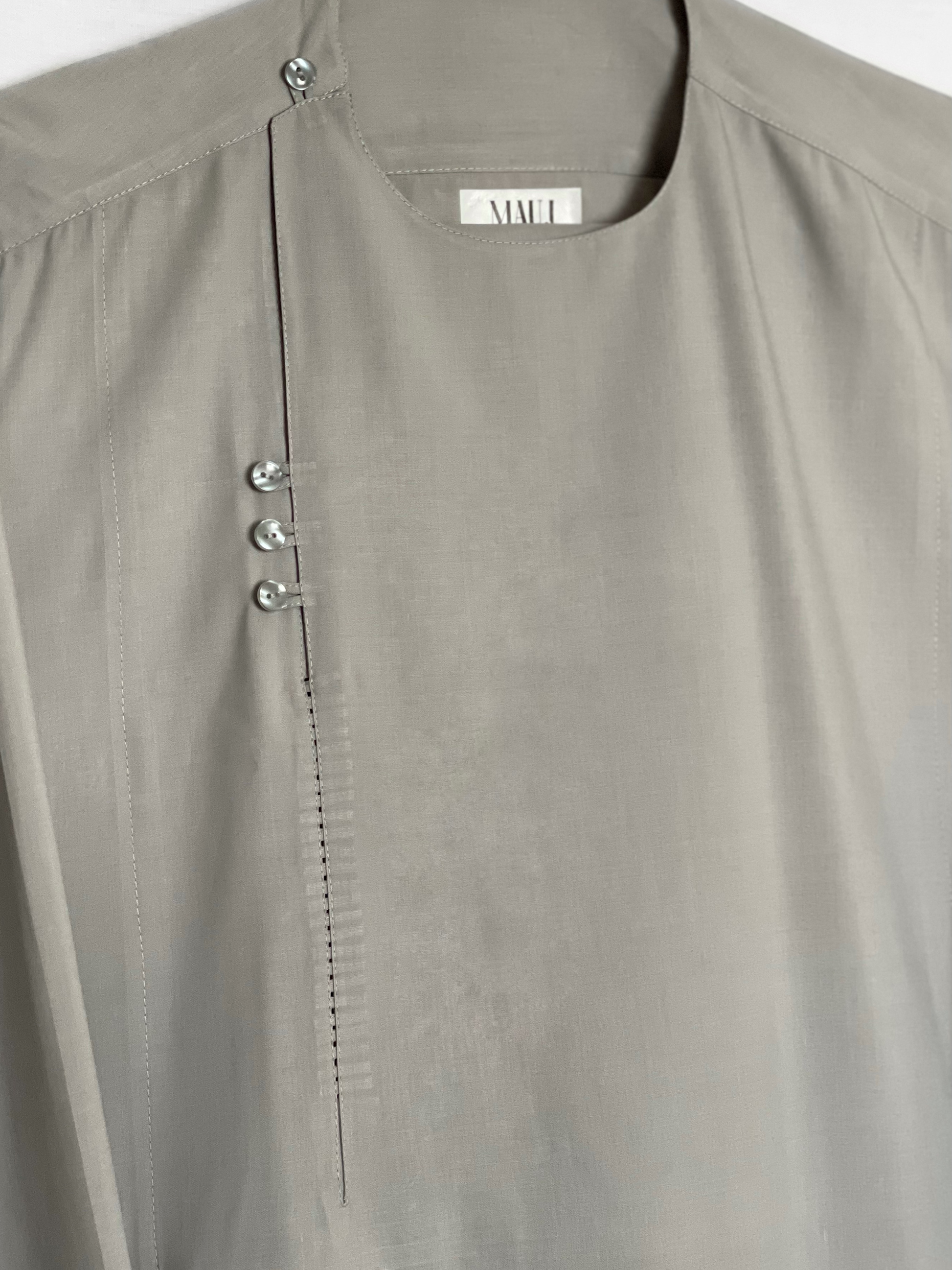 Two-piece long shirt with rounded hem and wide-leg drop-crotch pants in soft cotton. This particular style of Peran Tumban is native to Mazar-i-Sharif known for its minimal yet elegant design.