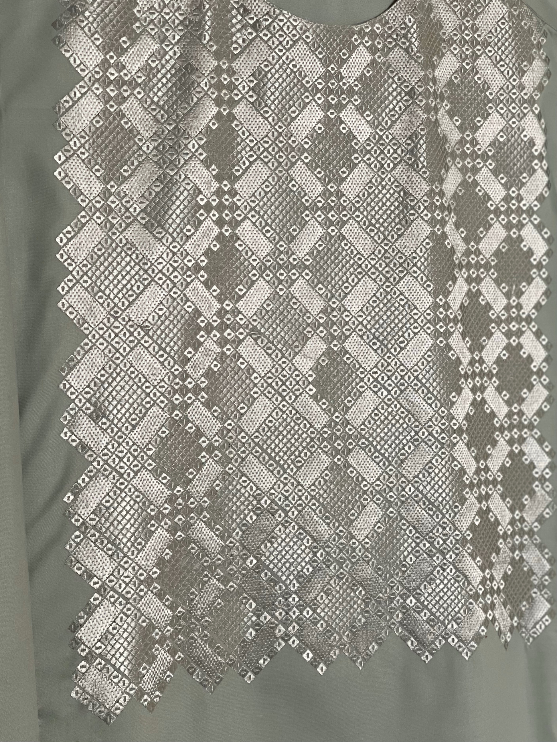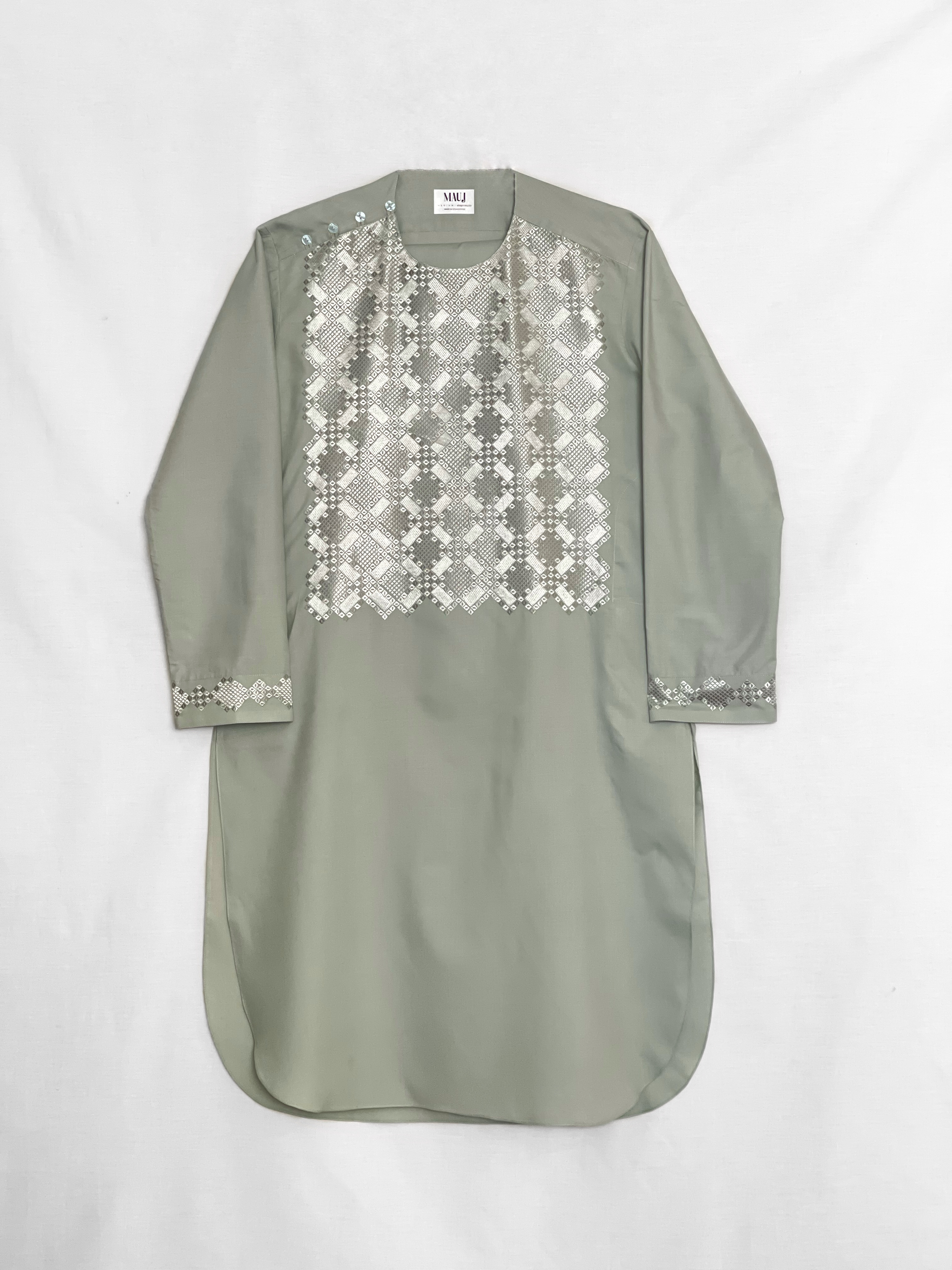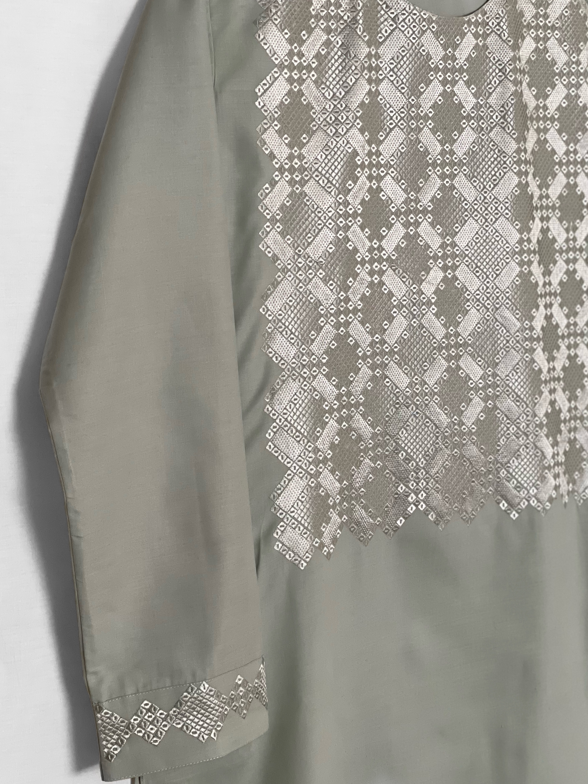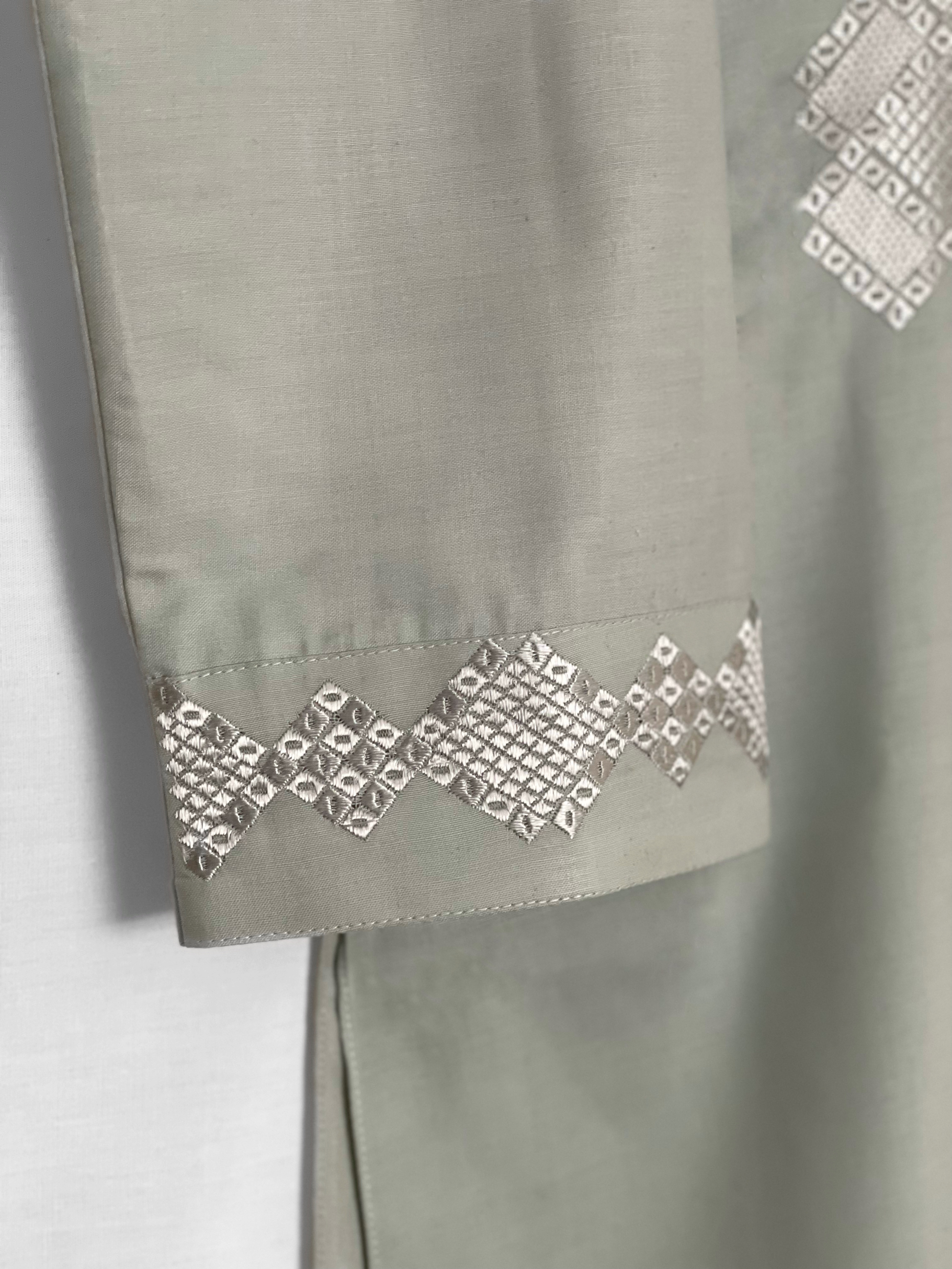 Two-piece long shirt with rounded hem and wide-leg drop-crotch pants in soft cotton. Featuring specially embroidered bodice and cuffs famous for its beautiful traditional Afghan geometric design.