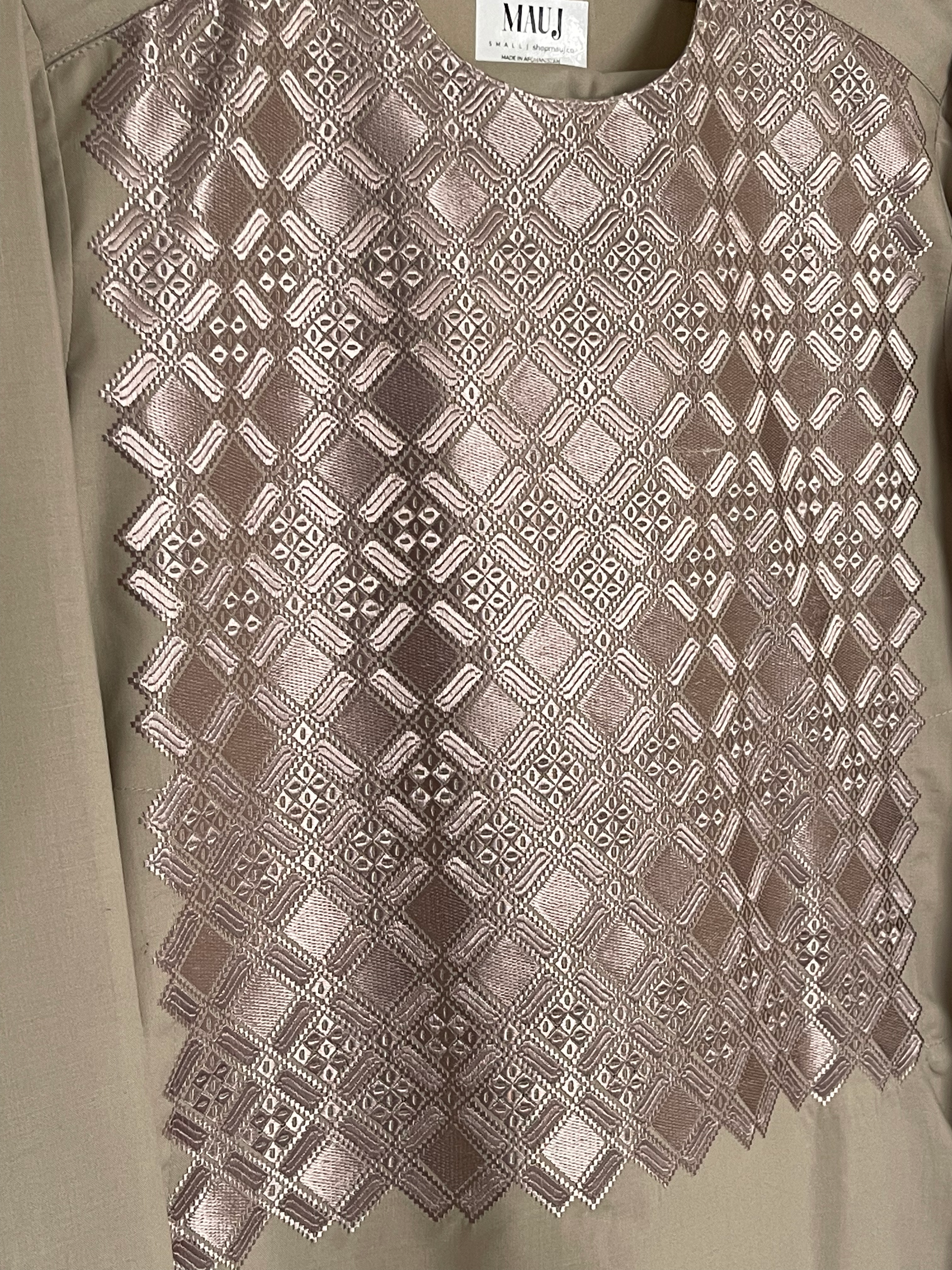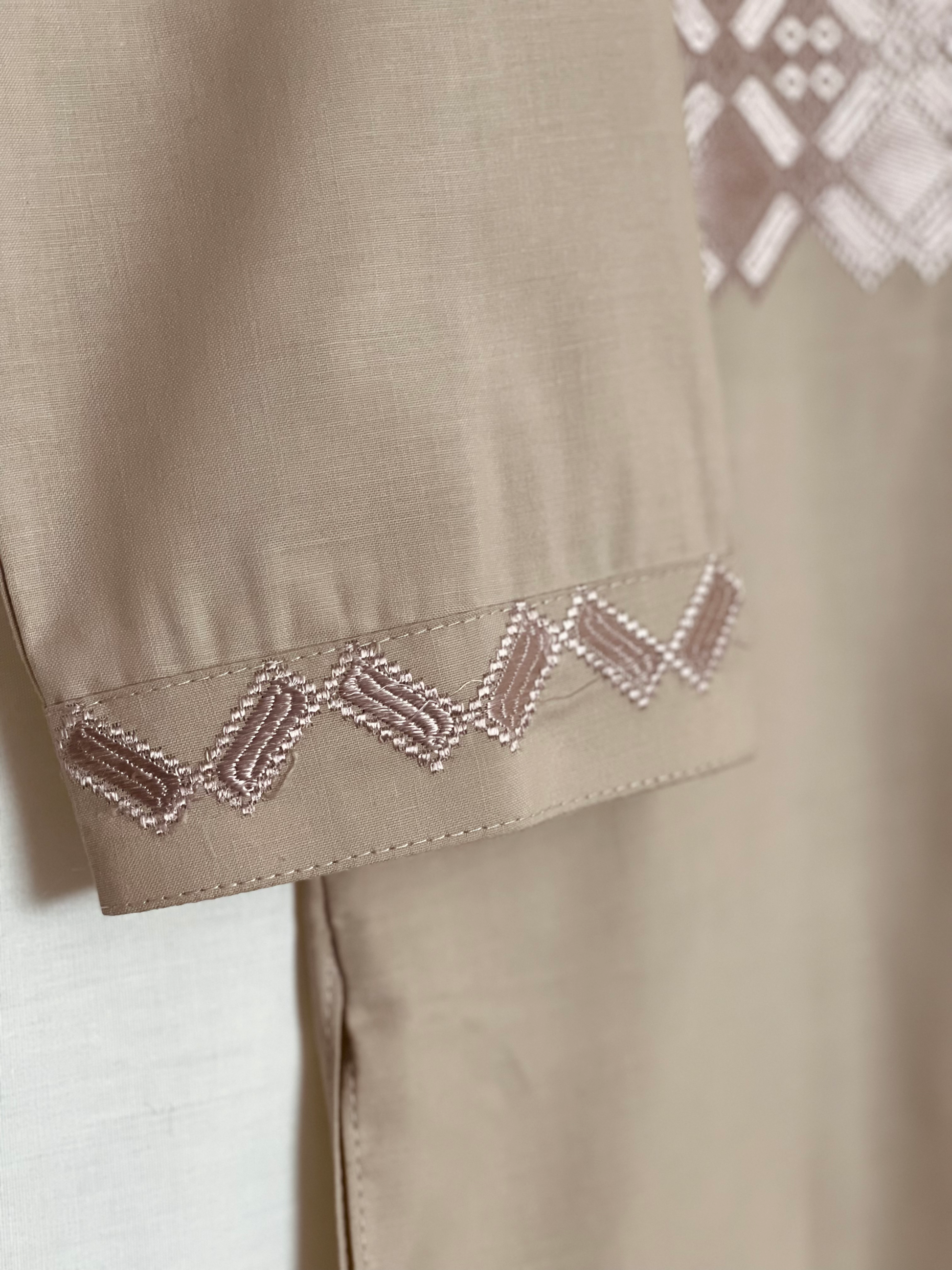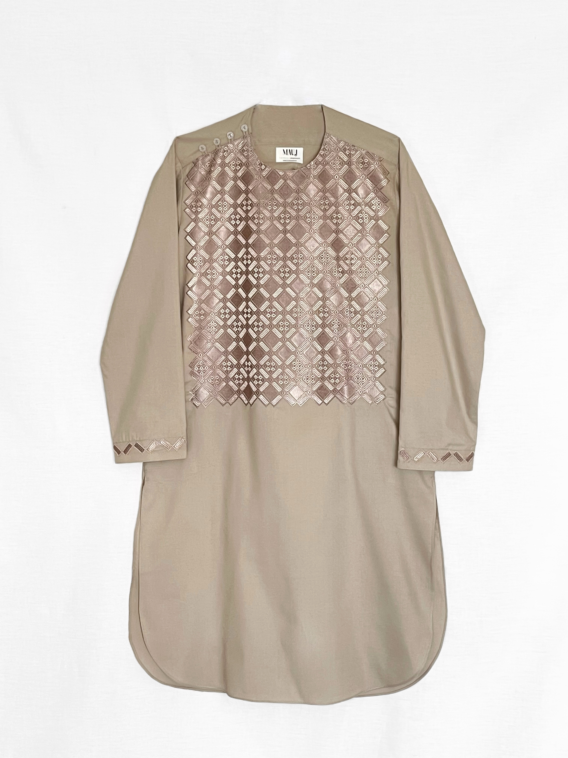 Two-piece long shirt with rounded hem and wide-leg drop-crotch pants in soft cotton. Featuring specially embroidered bodice and cuffs famous for its beautiful traditional Afghan geometric design.