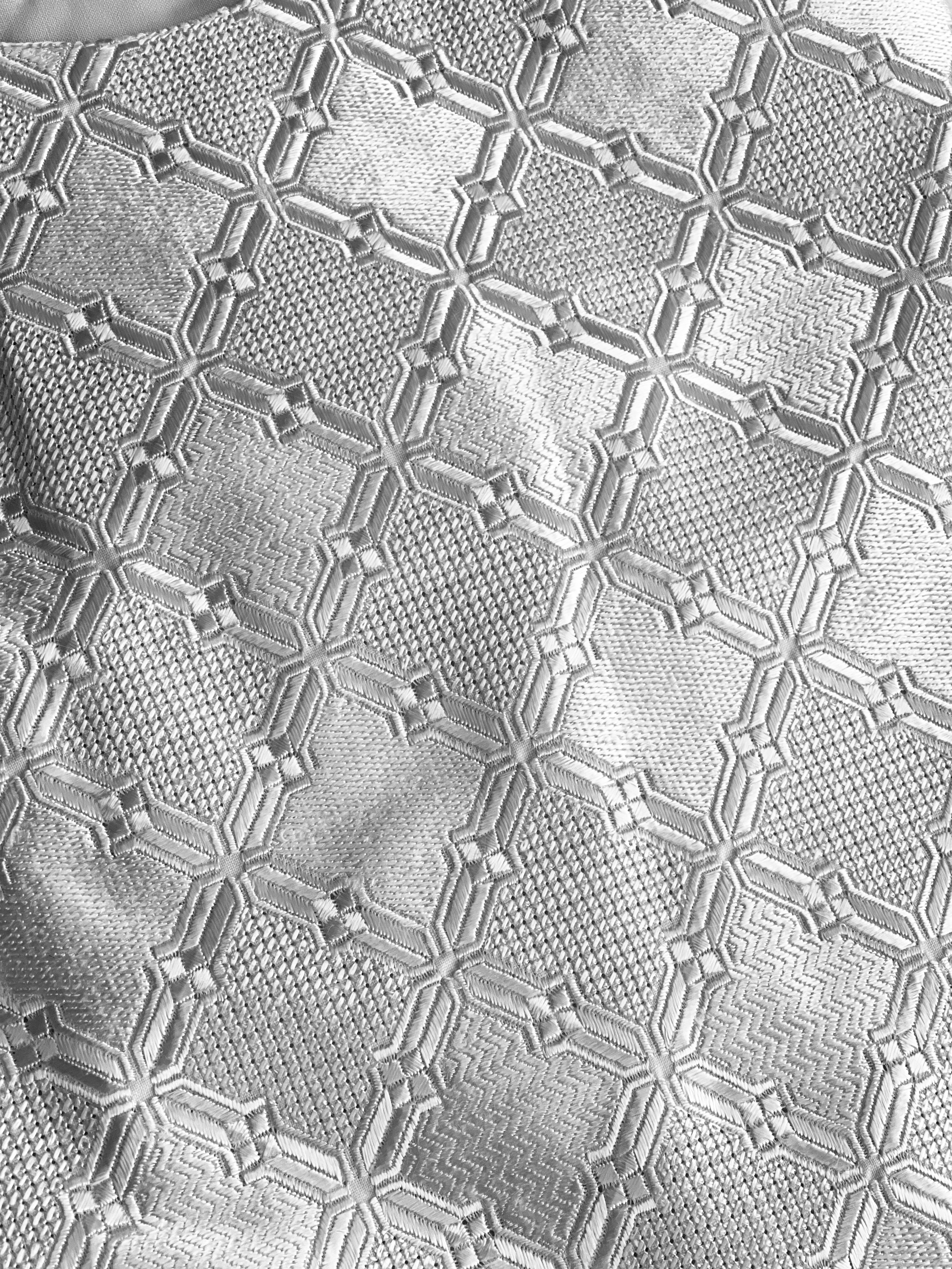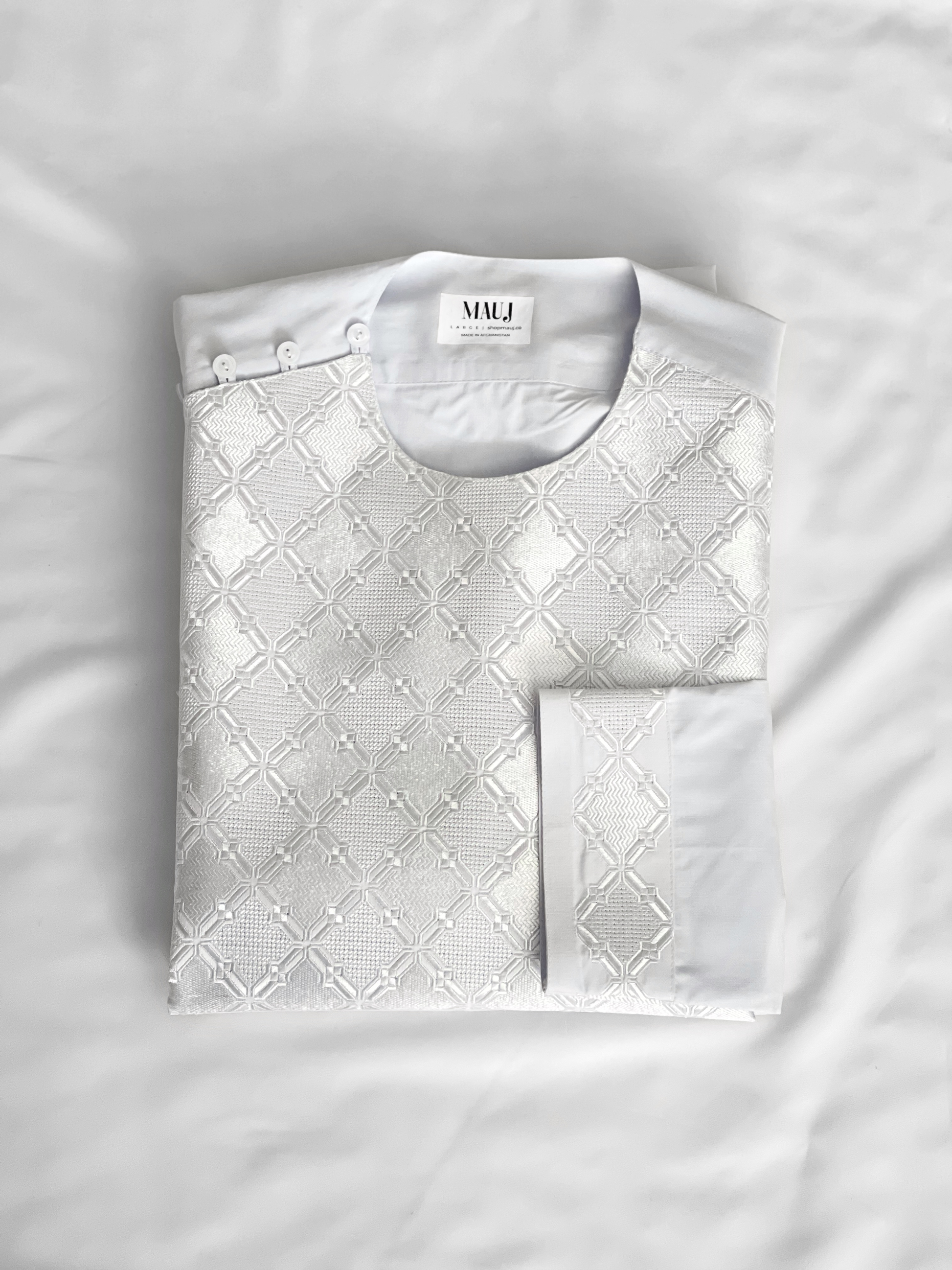 Two-piece long shirt with rounded hem and wide-leg drop-crotch pants in soft cotton. Featuring specially embroidered bodice and cuffs famous for its beautiful traditional Afghan geometric design.